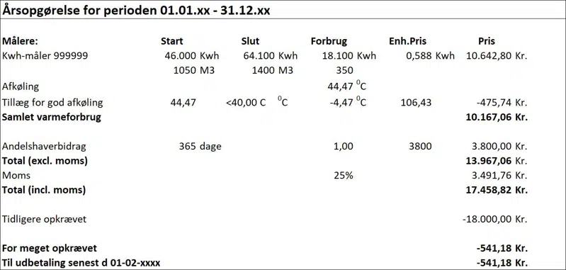 I januar måned laver vi en årsopgørelse på forgående år og laver nyt budget for det kommende år. Har man betalt for lidt, vil det blvie opkrævet sammen med aconto opkrævningen i februar XX. Har man betalt for meget, så vil det blive fratrukket i aconto opkrævningen.
